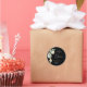 För en julomslutning av party favors eller gåva. En elegant, modern svart bakgrund. Dekorerad med vita och guld baublar och lite grej och en gräs-kon. Anpassa och lägg till ditt namn, år. Text: God jul