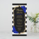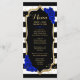 Menykort. Blankt svart royal med faux glitter guld. Svartvit rand med blå ro. Perfekt för en elegant party.