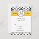 OSA kort för inbjudan till elegant Black and White Damask Wedding kan du anpassa. En vacker dammmönsterbakgrund accentueras med en cirkelformad utsmyckning och monogram ovanpå en gult som innehåller bruden och rummen namn. Photoshop-effekter med skuggor ge det här kortet ser ett 3D-lager ut direkt efter ditt val av papper. Bröllop-svarskort från Elke Clarke ©2010, 2012. Grafik licensierad. Ett elegant sätt att ställa in temat för bröllop. Anpassa med information om bröllop och bröllop-svarskort.