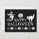 Happy halloween-pooki-inbjudan, hälsningskort Utformningen har jack o lantern, pumpor, häxa, spöke, skalle, måne, svart katt. Vit text och bilder mot svart bakgrund.