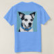 Illustration av en svart och vit hund som bär en blå krage mot en ljusblå bakgrund, som visar en lugn och ett uppmärksamt uttryck, som belyser hund milda beteende och charmerande utseende.