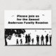 En bild av människor på en pick utomhus visas på en svart och vit vykortsinbjudan. Anpassa inbjudan med din egen familj namn som är tryckt ovanför bilden och annan återföreningsinformation på baksidan.