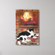 Svartvit katt som ligger framför öppen spis canvastryck