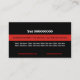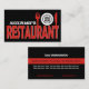 Affärskort som fångar upp öga på restauranger-textkalkplatta. En mall för visitkort för coola, med ord RESTAURANT, ägarens namn, en skylt, en gaffel och knivar i rött och vitt på svart bakgrund. Du kan ladda upp logotypen på plattan, lägga till monogrammet eller ta bort det.