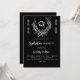 Svart bakgrund. En blommigt krans av lavendelblommor och vattenfärgade eukalyptus greenery. Anpassa och lägg till namn och detaljer. Vit text.