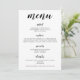 En enkel meny med svart och vitt rand på baksidan med enkel text och snyggt på framsidan. Den här menyn kan användas på egen hand eller som en komplimang till vår Svart- och Vita bröllopssvit. Kolla in den på Scriptiva Zazzle Shop - www.zazzle.com/scriptiva