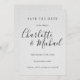 Med namnteckning stil namn på en vävd texturerad vattenfärg, papper bakgrund. Den här eleganten, grått och vitt om du sparar datumkortet, kan vara personlig med speciell händelseinformation i chicens svarta text. Designad av Thisisnotme©