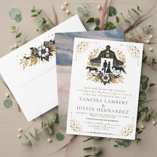Svartvit och Guld-Landsbyggsbröllop med QR-kod Inbjudningar