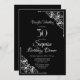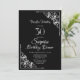 En svart och vit överraskningsmiddag i 30års födelsedag som innehåller ornerade diagonalhörn i snöre till ram om den vita texten.
