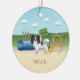 Desteis ursprungliga tecknad illustration av en svart och vit jacka hund av färg Papillon med lite hund-utrustning. Det finns ett hinder för grönt och gult färg A-ram, en blå tunnel, vissa röda och vita, stripade våtstolar och ett hopp från orangen färg däck. Bakgrunden har grönt backe och blå himmel med moln. Det finns också ett anpassningsbara textområde för en namn eller annan anpassningsbar.