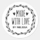 En personlig "tillverkad med kärlek"-dekal på en vit bakgrund omgiven av en lagerkrans. Gör det till din egen genom att lägga till din egen namn. En söt som avslutar beröring för alla handgjorda presenter. Designad av Blackberry Boulevard.