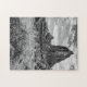 Ett svart och vitt foto av bildningen av lodrät sten i sydväst i Amerika, med en penselfabrik i förgrunden.