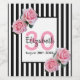 Ett märke för 30års födelsedag party. Klassiskt smalt svart och vitt lodrät rand som bakgrund. Med giftigt och feminin rosa ros som dekoration. En ram på framsidan med mall för ålder, namn och datum. Åldersnummer i rosa, namn och datum i svart. Namn är skrivet med ett handskript i stil.