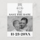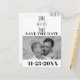Med det här alternativet sparar du vykortets datum och visar en fantastisk utformning med svart och vitt rand och ett monogram. Lodrät rand skapar en synligt tilltalande bakgrund, medan en runda ram, som läggs med initialer och två beundransvärda hjärtan, tillför lite elegans. Brevkortet innehåller också ett vackert foto av paret, som fångar kärlek och upphetsning för sitt kommande bröllop. Bröllop-datumet visas på en framträdande plats i fet typografi, så att gästerna inte glömmer den viktiga dagen. På baksidan av vykortet fortsätter vågrät rand och ger ett sammanhängande och snyggt utseende.
