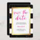 De här eleganterna är inbjudningarna från glam bröllop spara datum, som har svart och vitt rand, med faux guld ram och konetti. Modern shock rosa-typografi och text konkurrerar om snyggtens utseende.