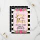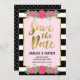 Den här chicens Spara har kortet Inbjudan ett faux guld gräns, svart och vitt rand och vissa rosa ros. I inbjudan ingår också en baksida som är mönstrad. Anpassa den här inbjudan genom att ersätta platshållartexten i mallen. Om du vill ha fler alternativ, till exempel att ändra teckensnitt, klickar du storlekt på knappen "Anpassa". *Observera att Zazzle Watermark som visas i zoomförhandsvisningen INTE visas på den slutliga tryckta produkten © Rosewood and Citrus