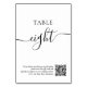 Elegant svartvit skript bröllop-bordsnummer, med QR-kod för att söka efter dina gäster för att deras foton.