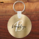 Den här nyckelkedjan för personlig i elegant har ett monogram och första namn i ett modernt svartvitt skript på en guld borstad bakgrund i metall.