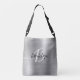 Den här elegant personligen korsar en säck har ett monogram och första namn i det moderna svartvita manuset på en silver faux borstad metall bakgrund.