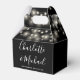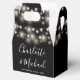Elegant bröllop-förmånslåda med söt string ljus, chic white namnteckning skript namn och speciellt datum på svart bakgrund. Du kan anpassa dig med ditt eget tack till ditt meddelande på motsatt sida. Ett perfekt sätt att tacka gästerna! Designad av Thisisnotme©
