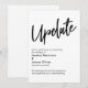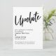 Den här svitens distinktion beror på det fet, avslappnad handskrivet skriptteckensnitt som används för accentfraser. Om du är i stånd att informera dina gäster i bröllop om att du har varit tvungen att stänga av dina giftermål-planer, så är det här ett djärvt alternativ som du säkert inte får förbise. I det här biet används det handskrivna skriptteckensnittet för att skapa en enkel grafik som skildrar "Uppdatera" i ord. Använda mallen fält om du vill lägga till dina personuppgifter och göra den här moderna designen till din egen. Den vita bakgrunden kan ändras till valfri färg. Var god kontakta alla speciella förfrågningar eller anpassa hjälpen. 105