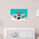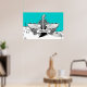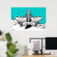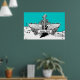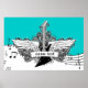 Svartvit elgitarr med vingar poster utskrift, med ett elektriskt gitarr, vingar, flammor och snurrar på musikpentagram, anteckningar och treble clef på turkosidblått bakgrundsmönster. En underbar gåva till en musiker, gitarr eller älskare.