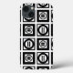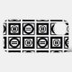 Djärva geometriska svart mönstersärdrag fyra kvadrerar med vitutrymme dem emellan. Tvåna som diagonalt tjockt motsätts, kvadrerar varje innehåller en tunn svart cirklar med en tjock likhetsteckeninsida. I kontrast kvadrerar de tunna tvåna varje innehåller en tjock svart cirklar att handlag fyrkantens kanter med en tunn vertikal likhetsteckeninsida.
