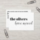 Behålla dina vänner och din familj och dina nya adress med hjälp av dessa moderna svarta och vita höljeskort. Konstruktionen har en kontrasteffekt mot typografi inslag, i all gemener brev. Din familj namn visas i ett fet, tungt serif-teckensnitt till lämnad om kortets framsida. Under det till högerna har jag placerat ett typografiskt överlägg som har ett modernt handskriftsteckensnitt som lyder "har flyttat". På baksidan användes serif-teckensnittet i mallkonfigurationen där du lägger till dina personuppgifter. använda bara det angivna fält för att ersätta min utrymmesinnehavartext med din egen. Dessa uppgifter visas lämnat och längst upp på baksidan. På högerna grund har jag lagt till "håll kontakten" med samma typsnitt framifrån. Om du vill ändra teckensnitt eller storlekar för någon av dina personliga uppgifter klickar du bara för att anpassa ytterligare. Även där kommer ni att kunna lägga till mer linjer text, t.ex. ytterligare mobila nummer, om det skulle behövas. Bakgrunden har ställts in som ett redigerbart vitt objekt. Ändra detta till valfri färg. // Det finns också en ändring med en ordalydelse som är lämplig för en persons flyttningsuppgifter. designad av Melody Watson för Pappra Muserie.