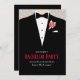 Elegant grafisk bröllopsgäst i smoking och en ensam röd ros för inbjudan till möhippa. Redigera dessa inbjudningar med dina egna ord, brudgummens namn och detaljer om förbröllopsfestligheter. © Unik design och grafisk konst av Sarah Trett. www.sarahtrett.com för www.mylittleedenweddings.com