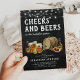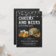 Rustika inbjudningskort för möhippa med en bakgrundseffekt på svart tavla, ett urval av vattenfärg öl, kringla och ett ölfat, strängljus och en modern "skål och öl" festmall som är lätt att anpassa.