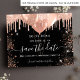 Observera att det här Spara datumet är pappert och mycket tunt. Kuvert ingår inte. Om du vill ha ett tjockare Spara datumkortet (samma design) kan du besöka vår butik. En svart bakgrund dekorerad med ro guld, faux glitter-droppar, gnistor och ballonger. Anpassa och lägg till datum och namn/ålder. Texten: Spara datumet skrivs med ett stort trendig-handskript i stil.