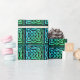 En biet av pappra inslagning av en blå grönt Celtic Knot-design mot svart bakgrund.
