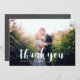 Tackkort med ett vackert handskrivet teckensnitt i vitt ovanpå ditt valda foto. Baksidan har en svart tavla-bakgrund med matchande teckensnitt.