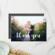 Tackkort med ett vackert handskrivet teckensnitt i vitt ovanpå ditt valda foto. Baksidan har en svart tavla-bakgrund med matchande teckensnitt.