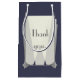 Paket ger till dina medhjälpare, marskalkar, familj och alla andra som förtjänar något speciellt i dessa presentpåsar, perfekt för bröllop eller evenemang med ett litet klassiskt 20-tal. Framsidan av den här stålblå väskan dekoreras med en Art Deco-inspirerad silver ram och stiliserade strålkastare som belyser ett enkelt "Tack". Baksidan har en matchande ram och strålkastare med exempeltext som du kan anpassa för att passa in informationen på din speciella dag. Se till att kolla in de andra produkterna i Sanky Art Deco in Blue-setet för att skapa en verkligt samordnad syn på evenemanget.