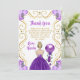 This sweet sixteen birthday thank you card invitation features an elegant gold frame, a beautiful princess with blonde hair and a purple dress, flowers and a balloon.