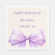 A soft ivory background color. Decorated with a large lavender colored bow. Personalize and add the name and date. Text: Happy Birthday!