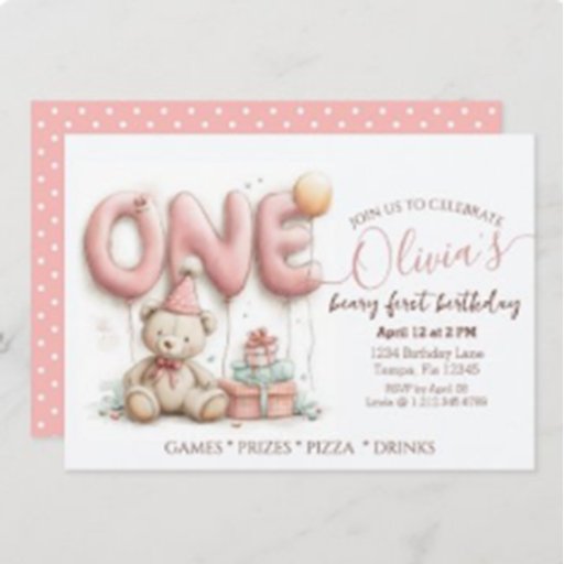 Celebrate a little one's milestone with this charming first birthday invitation featuring a festive teddy bear, pastel balloons, and wrapped gifts. The front design radiates playful warmth, while the reverse side adds a touch of whimsy with soft white polka dots on a pink background. Ideal for customizable layouts that blend cuteness and celebration.