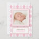 En söt rosa och vit argyle-bakgrund med mönster accentueras med en faux presentkort märkre och ramar två foton av din kära lilla flicka på både framsidan och baksidan. Utrymme för all födelseinformation och familjeinformation om detta tvåsidiga meddelande gör det till ett underbart val att låta familj och vänner få kännedom om dina underbara nyheter.