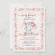 Den berömvärda duschkonstruktionen i flicka med den sötaste flicka-elefanten inramad med rosa vattenfärgsblommor och med guld konetti. Vänd över inbjudan för att visa en samordnande rosa blommigt tillbaka.