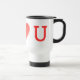 Teknisk design med ett gummikandisamma med "kärlek" skrivet på det i röda nyanser och rosa på vit bakgrund. Resa/pendla mugg med ett anpassade som du kan anpassa med din egen text, bilder och dina idéer. Skapat med hjälp av ett originalfoto och digital teknik av Jess Perry.