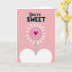 This greeting card features a soft pastel pink background that feels gentle and romantic, like a quiet blush behind a sweet note 🥰. Near the top, the text reads “You’re Sweet,” with “You’re” in smooth, flowing red lettering and “SWEET” in all-caps red letters edged with a light blue shadow. Centered below the words is a candy-like flower that looks like a lollipop turned into a sunflower, drawing your eye like a little token of affection ❤️. Its round face is made of concentric pink and white rings, surrounded by crisp white petal rays that radiate outward. In the middle sits a deep red heart, giving the design a tender, love-forward focal point without needing any extra characters. A slim pastel blue stem drops down from the flower to the bottom area, where two soft white cloud shapes sit symmetrically at the lower edge. The overall look stays flat and graphic, with the blue shadow on the top text and the red heart standing out against the pale pink field.