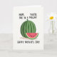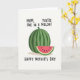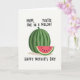 Designed with a sweet summer-fruit theme, this Mother’s Day card features a large round melon with alternating dark and light green vertical stripes against a creamy off-white background. In front and slightly to the right sits a cut wedge, showing bright pink flesh dotted with glossy black seeds, like a little love note in fruit form ❤️. The gentle contrast between the cool green rind and the lively pink center gives the scene a warm, affectionate energy. Across the top, dark lettering in a casual hand-drawn style reads, “MOM, YOU’RE ONE IN A MELON!” with the words centered above the fruit. Near the bottom, “HAPPY MOTHER’S DAY” appears in simpler dark text, aligned neatly beneath the illustration. A soft shadow under the melon adds a touch of depth, keeping the fruit grounded without crowding the open space 🌼. The seeds in the wedge are scattered in irregular shapes, and the rind edge is trimmed with a thin pale band that frames the pink interior.