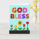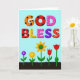 This greeting card features a digital illustration with the large, two-line text “GOD BLESS” centered near the top in plump, three-dimensional letters that feel as sweet and friendly as shared treats ❤️. The words sit on a soft cerulean-blue background, giving the message plenty of open space to breathe. Each letter has its own decorative pattern: warm orange and deep red letters carry black polka dots, while sunny yellow and pink letters are sprinkled with tiny red specks like confetti. A deep purple letter is dotted with darker flecks, and the final red “S” stands out with thin white stitched-style lines that suggest care and closeness. Beneath the text, a dark brown strip of ground stretches across the bottom, like a simple garden bed ready for a small celebration. From this soil rise five stylized flowers on slender green stems, their shapes leaning toward one another in a gentle, companionable way 🌼. The flowers include a small purple bloom with a golden center, a bright orange flower, a larger yellow sun-like blossom, and two red tulip-shaped flowers against the dark earth.