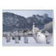 Lussa hybrider mellan pingviner och elefanter som har roligt på en trevlig vinterdag, leker i snö - en har fastnade i ett stort snö boll. Bakgrund visar Unken i Salzburg, Österrike