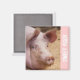 Fotografi av gris på rosans bakgrund med ord "söt piggi" tryckt längs sidan.