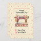Express your love with this whimsical sewing machine themed flat card adorned with hearts and other sweet accents. Image of a pastel colored sewing machine has editable text and additional space for your personal note on the back. Printed on a cream background with pink hearts for added charm. Cute design for quilters and sewing enthusiasts.