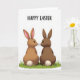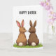 Designed with two stylized long-eared creatures sitting upright on a small patch of green grass, the scene captures them leaning in close with their noses nearly touching, like a quiet hello between close friends. One is a soft caramel brown with pink inner ears, while the other is a deeper chocolate brown that makes the pair feel naturally matched. Their simple black eyes and fine whiskers give them an attentive, tender look, as if they’re sharing a private moment. Each has a round, fluffy white tail that adds a gentle, cuddly touch to their smooth, rounded bodies. Above them, a seasonal greeting appears near the top in large sans-serif letters, set in a dark tone that stands out clearly. The wide white background keeps everything airy and focused, with earthy browns, fresh greens, and soft pinks working together like early spring 🌷🐰. The grass beneath them is a small, bright green tuft with a few blades pointing upward against the white space.