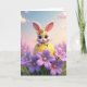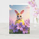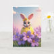 This design shows a light-brown furry bunny character 🐰 with long ears tipped in pink and a small yellow bow, peeking out of a cracked golden-yellow eggshell covered in white polka dots. The bunny’s big blue eyes and gentle smile angle outward as if searching for a familiar face, giving the scene a tender, friendly warmth. Its little paws rest on the shell’s edge, as though it’s leaning forward to greet someone close. Around the base of the egg, clusters of lavender-purple flowers with rounded petals and sunny yellow centers gather like a soft garden border 🌷. Behind them, the background fades into blurred pastel foliage and more blooms, keeping the focus on the bunny and its shy, affectionate expression. Near the top, a short Easter message sits centered in a light-colored font against the sky, easy to spot without crowding the artwork. The sky shifts from soft blue into warm peach with thin, wispy clouds drifting across the upper edge.