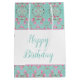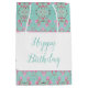 Anpassa grattis på födelsedagen-texten till varje särskilt tillfälle vid denna dekorativa designade presentsäck i teal och rosa och ett brunt sken. Text kan också tas bort om du vill, och tealbakgrund kan växlas till valfritt färg för att komplettera stil.